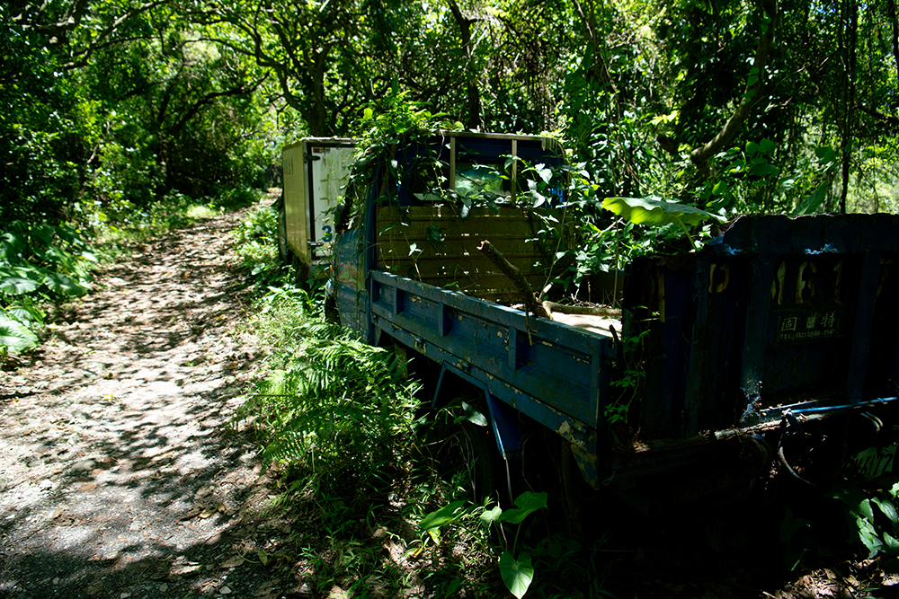 この小さな廟のあたりから道が平坦になり、どこへ続くんだろうと進んでみたら、すごいことになっているトラックがあり、その先は車も通る山道でした。